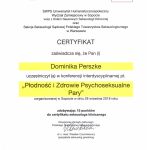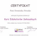 Nazywam się Dominika Perszke i zawodowo zajmuję się pomaganiem ludziom. Ukończyłam studia biologii na Uniwersytecie Mikołaja Kopernika, gdzie poznałam naturę organizmu człowieka i jego budowę, co pozwala mi w mojej codziennej pracy terapeutycznej lepiej rozumieć specyfikę i przyczyny problemów, z którymi przychodzą do mnie Pacjenci. Następnie ukończyłam studia z zakresu seksuologii klinicznej na Uniwersytecie SWPS. Zdobytą dzięki temu wiedzę i umiejętności mogę wykorzystać do radzenia sobie z problemami zdrowia i życia seksualnego, rozwiązywania problemów par oraz wszelkimi zagadnieniami związanymi z płciowością, orientacją seksualną, dojrzewaniem, erotyzmem i seksualnością we wszelkich jej przejawach. Ukończyłam także studia z zakresu psychologii na Uniwersytecie SWPS. Studia te otworzyły mi możliwość pomagania ludziom, których dotykają problemy natury psychologicznej, między innymi: stres, lęki, depresja, smutek, napady agresji, problemy w związkach, kryzysy w związku z rozstaniem i wiele innych. Ukończyłam także studia podyplomowe na Uniwersytesie SWPS z zakresu neuropsychologii. Dzięki nim jestem w stanie pomagać ludziom w zmaganiu się z problemami związanymi z funkcjonowaniem mózgu, między innymi z zaburzeniami koncentracji i uwagi, zaburzeniami pamięci, zaburzeniami poznawczymi, zaburzeniami zachowania, oraz zaburzeniami kontroli emocji. Obecnie jestem w trakcie czteroletniego kursu z zakresu terapii poznawczo-behawioralnej, który pozwoli mi jeszcze dokładniej rozumieć przyczyny problemów moich Pacjentów i znajdować metody na radzenie sobie z nimi.